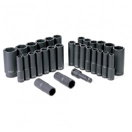 • Set contains 6 Point Fractional sizes 7/16" to 1-1/4" and metric sizes 10mm to 27mm in deep length; plus two flip sockets and 3" extension for wheel service.